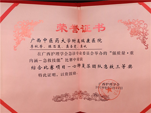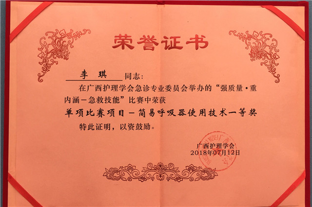 为切实提高急诊护理人员的急救水平,加强急诊急救质量与内涵建设,2018年7月12日,由广西护理学会急诊专业委员会主办的“强质量.重内涵-急救技能”比赛正式开赛,我院参赛代表喜获佳绩。