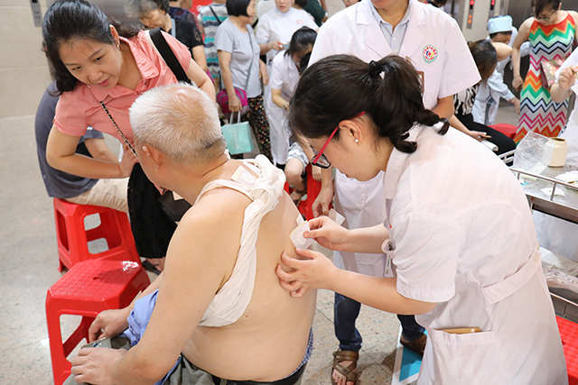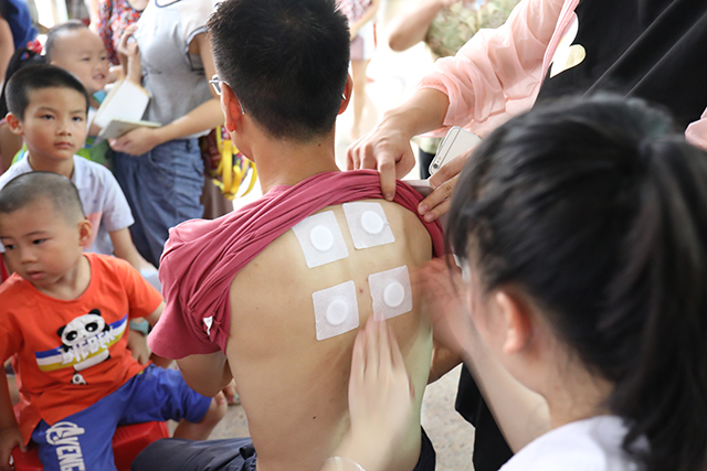 活动现场,各科室医务人员或站着、或坐着、或蹲着,针对群众的需求对不同穴位进行贴敷,并耐心地解答他们的疑惑,对相关疾病提出了日常预防、保健及治疗建议。