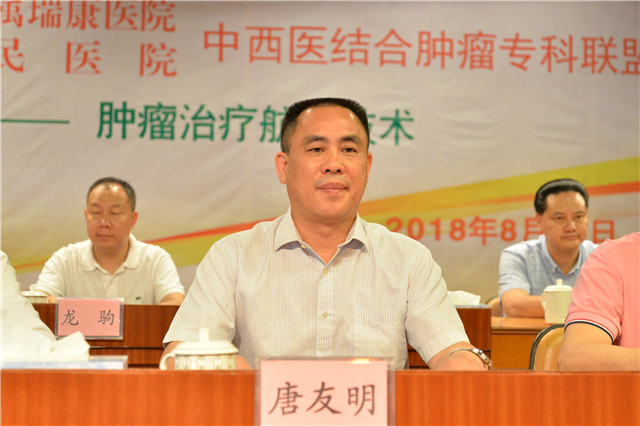 我院院长唐友明对化州市委市政府、卫计委以及化州市人民医院对我院的信任和支持表示感谢。他向到场嘉宾介绍了我院的发展历程、学科建设及医疗技术的情况。他指出,射波刀作为全球顶级精确放疗设备,有不开刀、无出血、无疼痛、不麻醉、精确杀灭肿瘤的优势,同时我院研制多种抗肿瘤制剂,开展“射波刀+化疗+中药”的综合疗法,治疗肿瘤效果显著。党的十九大要求深化医药卫生体制改革,建立医院医疗联合体、推进分级诊疗工作是国家医改新政的重要内容,遵照国家的部署和要求,瑞康医院在这方面做了大量的工作,以优势专科作为龙头,建立紧密型专科技术合作。这次与化州市人民医院建成广西中西医结合肿瘤专科联盟,为专科联盟的大家族增添了强大的新生力量。肿瘤疾病是南方地区的高发病,面临着严峻的防治挑战,各地诊疗水平存在差异,如何优化资源造福百姓是我们需要思考的问题。未来将结合两家医院的工作实际,相互扶持,进一步探讨联盟运作,合理利用医疗资源,通过两家医院的紧密协作,缓解基层群众看病困难问题,共享卫生改革发展红利。