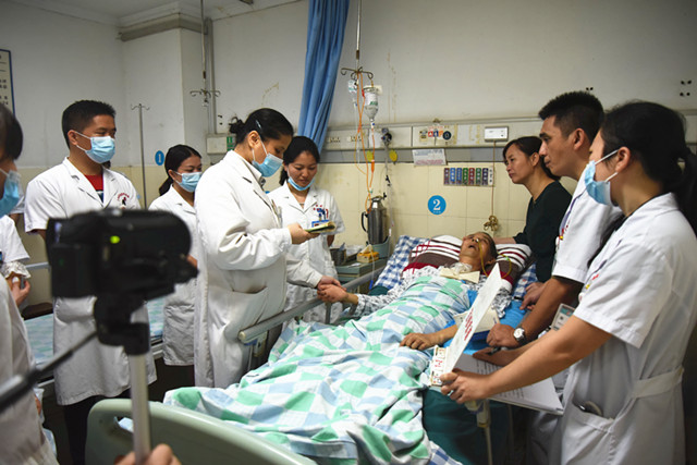 义诊现场,我院神经内科、神经外科、脊柱外科、儿科等多科专家与广东三九脑科医院义诊团队凭借丰富的临床经验,耐心细致地了解病情,为患者查体,提出治疗建议,并针对常见病,耐心热情地对群众传播保健知识。我院医护团队还通过测量血压、赠饮保健茶等方式,为到场群众提供优质的就医体验。此外,专家们利用义诊间隙,到我院病房开展教学查房及疑难病例讨论。