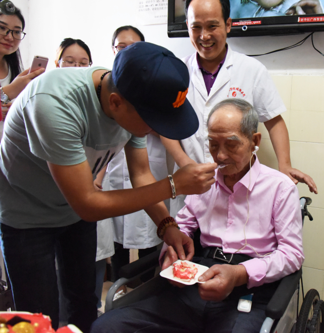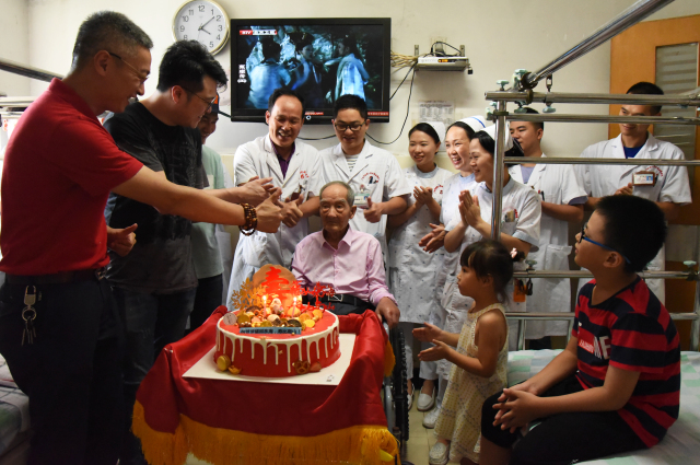9月6日下午,我院关节与运动医学科医护人员为当天正式迈入102岁在该科住院的寿星老人许老先生过生日。在生日会现场,不仅有关节与运动医学科的医务人员、许老先生的儿子、孙子,还有曾孙和几位病友,四代同堂其乐融融,祝老人福如东海,寿比南山。