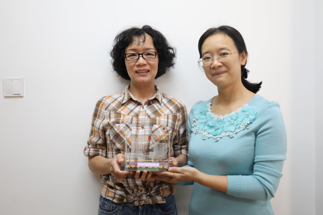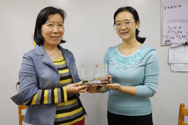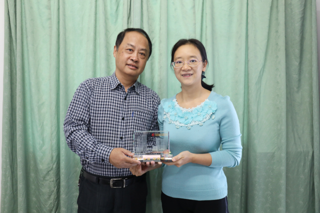 最后,人力资源部职改办主任彭爱莲代表医院向黄小华、梁冰茕和陈欣赠送纪念品。