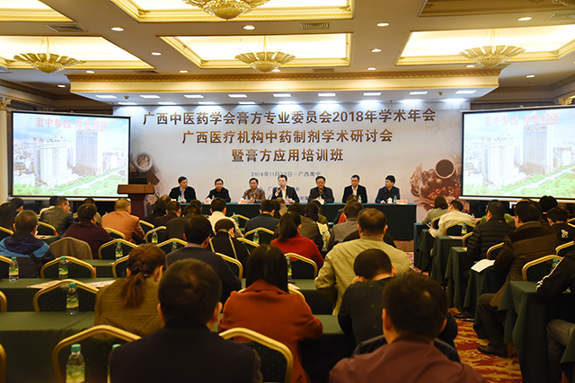 11月23日,由广西中医药学会主办,我院承办的广西中医药学会膏方专业委员会2018年学术年会、广西医疗机构中药制剂学术研讨会暨膏方应用培训班在凤凰宾馆举办,我院党委书记高宏君,广西中西医结合学会秘书长李方,世界中医联合会药膳食疗研究专业委员会秘书长,深圳宏元堂中医院院长陈宏斌,中华中医药学会胶类中药和膏方临床应用指导老师、四季膏方技艺传承人姚国平,我院治未病中心主任黄彬等领导和嘉宾出席开幕式,来自区内各地医院代表、膏方专家近200人参加会议。黄彬主任主持开幕式。