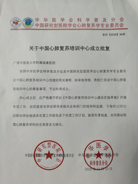 11月25日,中国心肺复苏培训中心(广西中医药大学附属瑞康医院)评审会议在我院B座23楼会议厅举行。我院顺利通过评审,中国心肺复苏培训中心站点正式落户我院。中国研究型医院学会心肺复苏学专业委员会主任委员、中华医学会科学普及分会主任委员王立祥,中国研究型医院学会心肺复苏学专业委员会副主任委员孟庆义、李静,副秘书长汪茜组成的专家组对我院进行评审。医院党委书记高宏君,副院长韦思尊,医务部主任、院长助理郑东林等相关部门负责人到场参加评审会。
