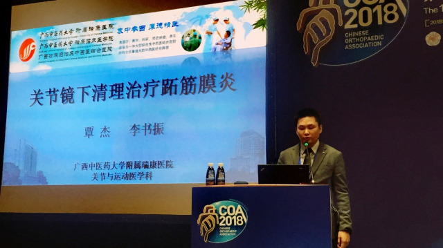 本届COA盛会,聚集海内外300余骨科专家、25000余名骨科同道,共同探讨、学习、分享经验,共享骨科领域的饕餮盛宴,充分展示了各学科亚专业的最新研发成果、国际领先的新技术及临床最新进展。会上各位骨科前辈鼓励新一代骨科同仁在开展基层教育、举办学术会议以及促进骨科创新的工作中上发挥更大的潜能,我院关节与运动医学科覃杰医师在会上作了题为“关节镜下清理治疗跖筋膜炎”的发言。