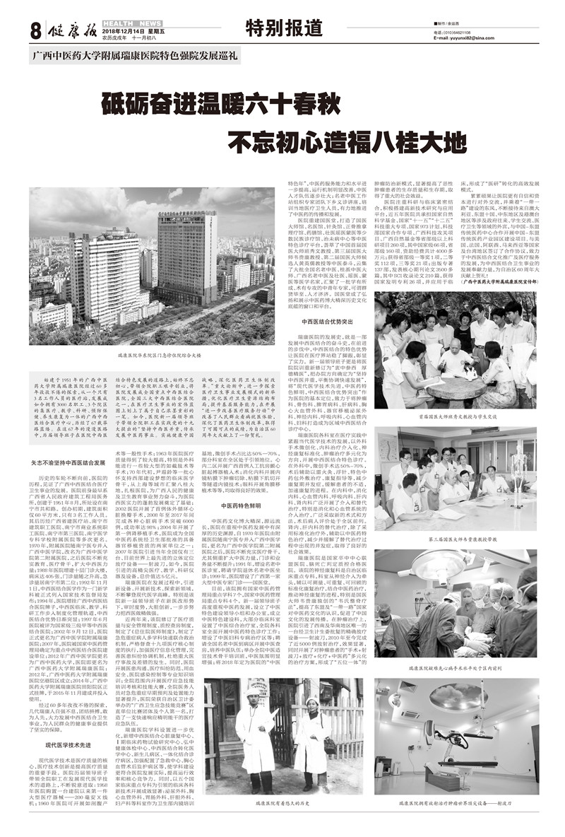 2018年12月14日,《健康报》刊登《砥砺奋进温暖六十春秋 不忘初心造福八桂大地 ——广西中医药大学附属瑞康医院特色强院发展巡礼》一文,文章如下: