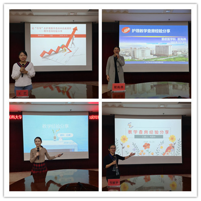 会上,五位优秀护理教学老师分享教学查房经验,她们从工作目标、实施步骤、工作亮点、效果评价、持续改进等方面作了精彩的汇报,眼科吕婵护士长从理论示范课展示及青年教师教学基本功竞赛经验,肾内科王艺护士长从护理查房教学的设计与创新心得,重症医学科教学秘书梁海燕从本科室病例的急、危、重的特点、妇科教学秘书黎秋艳从体现人文关怀的重要以及心血管内科韦丽华副护士长从护理团队建设在保障护理教学活动中的具体落实等方面进行介绍,给大家留下了深刻的印象。