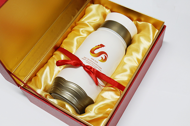 《暖心》杯杯盖为《鼓舞》纪念章正面图案,杯身为中央代表团赠送纪念品标识和“中央代表团赠”字样,杯底水纹样式。顶盖装饰图案采用水晶滴胶工艺,外沿镀金。杯身主体采用不锈钢材质,杯体内胆镀铜,外壳喷漆、贴花,杯口抛光,杯底水纹采用涨花工艺。