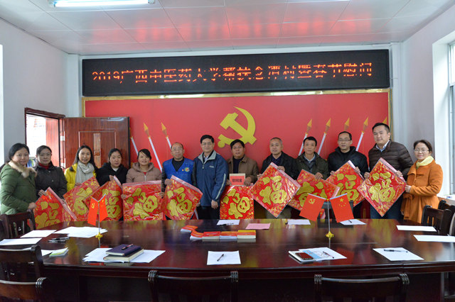 1月22日,广西中医药大学党委副书记何并文率领学校党委组织部部长唐振宇、党委宣传部副部长何世全,以及我院党委副书记、副院长陈日兰、部分职能科室负责人代表前往隆安县都结乡念潭村,代表学校和医院党委亲切慰问我院驻村“第一书记”吴汉周及念潭村村委,并为贫困户送上新年礼物。