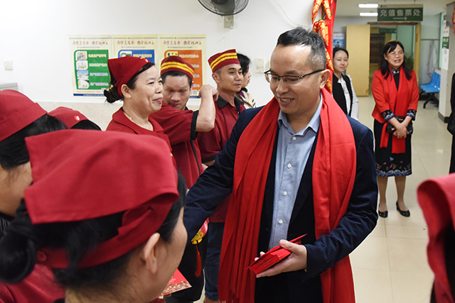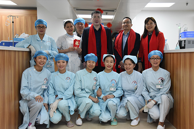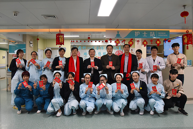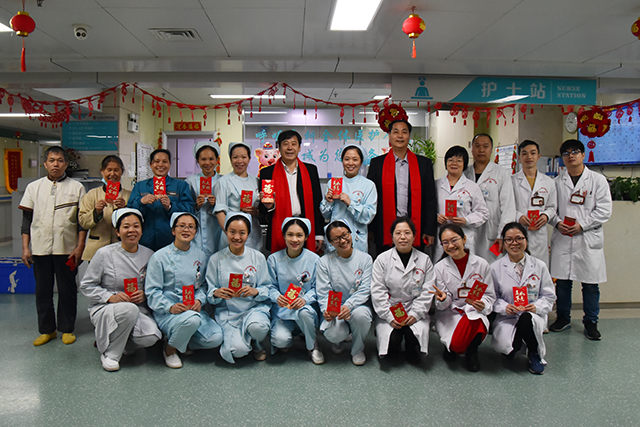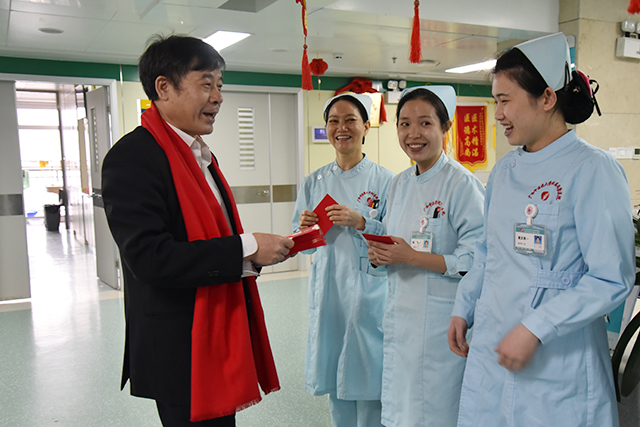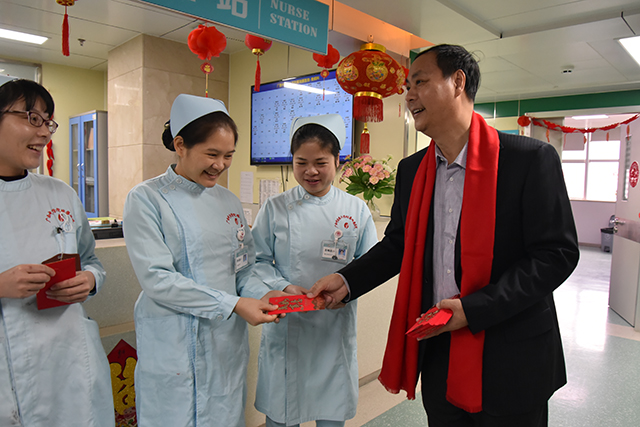 福猪迎春,瑞祥安康,除夕夜和大年初一,医院党委书记高宏君,副院长韦思尊,纪委书记黄建民,副院长陈锋带领相关部门负责人来到各科室,亲切慰问春节期间坚守临床一线的医务人员、后勤值班人员及住院病人,向他们致以节日的问候,为他们送去新春美好的祝愿。