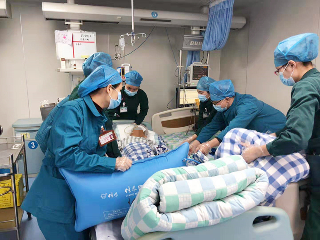 联合手术很成功,但患者转入ICU一区时仍昏迷、休克、急性呼吸窘迫、凝血功能障碍,随时可能有病情恶化,重症医学科伍民生主任带领的ICU一区团队立即制定了全方位抢救方案,予机械通气、抗休克、积极输血、容量复苏、止血、抗感染、器官功能保护、纠正凝血功能障碍、三角巾固定骨盆等一系列治疗措施。