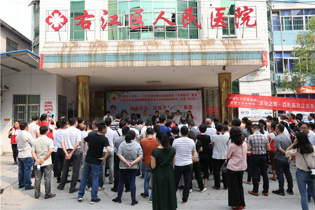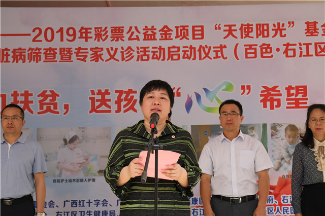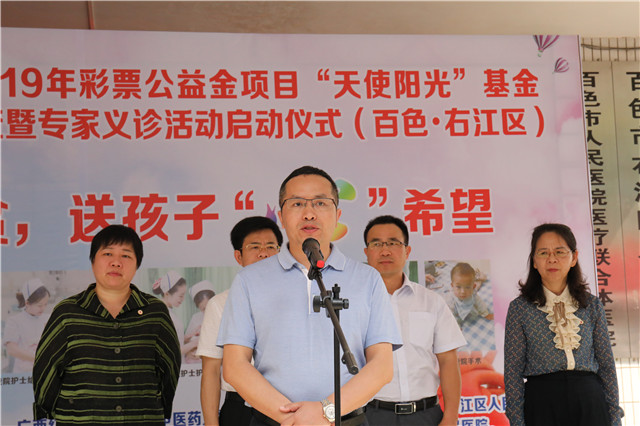 4月9日,由中国红十字基金会、广西红十字会、百色市人民政府、广西中医药大学附属瑞康医院共同主办的2019年度彩票公益金项目“天使阳光”基金儿童先天性心脏病筛查暨专家义诊公益活动在百色市右江区人民医院正式启动。广西红十字会专职副会长潘雪红、百色市人民政府副市长罗试坚、我院纪委书记黄建民、超声科主任龙平、胸心血管外科副主任范悦、百色市红十字会、右江区人民政府领导、右江区相关单位负责人及辖区各乡镇卫生院医生、乡村医生、部分患者家属参加了启动仪式。