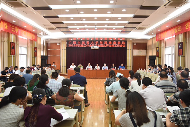 4月23日下午,为进一步落实中央、自治区和学校有关会议精神和工作部署,我院党委在B座十楼会议室召开2019年医院党的建设工作会议暨全面从严治党工作会议。会议对去年医院党建工作和从严治党工作进行总结,学习传达上级有关会议精神并动员部署今年党建重点工作和全面从严治党工作。广西中医药大学党委常委、纪委书记韦雪芳莅临大会指导,医院党委书记高宏君,院长唐友明,党委副书记、副院长陈日兰,副院长庞刚,纪委书记黄建民,副院长宋策出席大会,各党(总)支部书记和支部委员代表参加会议。唐友明院长主持会议。