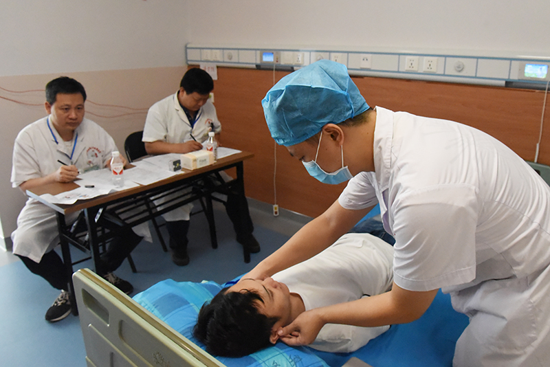 本次考核采取多站式考核的形式,考点主要设在医院B座10楼和19楼。第一站急救基本技能站、第二站体格检查站、第三站中医专项技能站、第四站临床技能操作站、第五站临床思维站。医院科学进行考站布局,精心布置考试物品,合理安排人员分工,严谨做好考务人员和标准化病人培训,确保考试规范有序进行。考生在引导员指引和哨音指令下,换站顺畅,衔接紧凑,每考站内考官严格按照考官培训要求和评分标准,客观评判,一丝不苟。