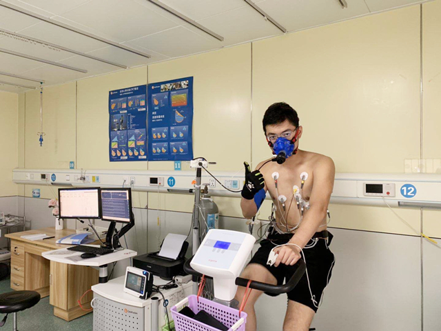 5月6日上午,横渡琼州海峡勇士许思敏在完成挑战后来到我院心脏康复中心检测心肺运动功能,就横渡成功的身体机能做专业检查。