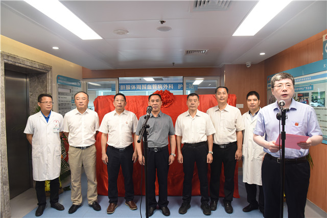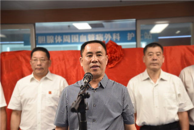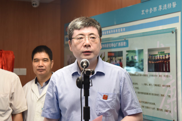 唐友明院长在致辞首先祝贺两个科室迁入新居,肝胆腺体周围血管病外科和胃肠肛门病外科是医院的拳头科室,也是重点发展的学科,经过几十年的发展,有了一支技术先进、医德高尚、梯队健全的队伍,近年来,在急危重症和高难度手术上得到了快速的发展。随着医学技术的进步,科室也开始推行外科的微创化、介入化,取得了不错的成绩,成为国家卫健委肝胆肠外科研究中心广西基地。他希望全体医护人员珍惜良好的工作环境,并以此为契机不断强化科室管理,不断提升医疗技术水平和医疗服务质量,并希望两个学科团结一致,勇攀科学高峰,立足把两个学科的常见病、多发病做细做精,形成特色优势。同时,唐友明院长指出,学科要有清醒的定位,注重中西医并重,即现代医学技术先进,中医药特色鲜明,中西医结合优势突出。