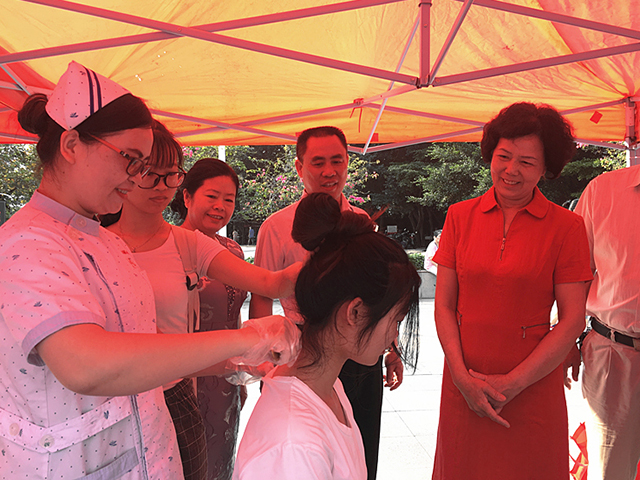 随后,我院护理人员向群众现场展示了八段锦、耳保健操、颈椎操等养生保健功法;免费让居民进行刮痧、拔火罐、艾灸、耳穴压豆等中医护理技术体验;指导群众进行心肺复苏急救技能练习。另外,来自我院内分泌科、耳鼻喉科、骨科、妇科、儿科的医疗护理专家围绕着常见病的保健指导、慢性病管理等方面向前来咨询的广大市民普及健康知识。