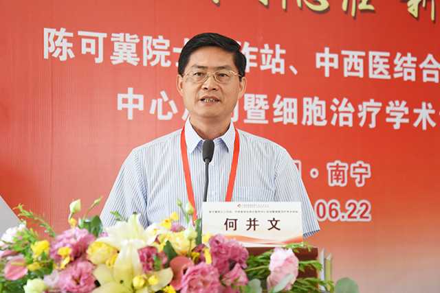 何并文副书记代表广西中医药大学党政领导对我院陈可冀院士工作站、中西医结合转化医学中心的启动表示热烈的祝贺,他指出,附属瑞康医院与陈可冀院士、马洁教授、李荣秀教授团队的携手为促进广西中医药大学、广西中医药事业与国内一流中医、中西医结合学术团队的交流互鉴、相互启迪提供了一个崭新的平台。希望医院不断加强交流与合作,积极探索中西医结合的新思维、新模式、新举措,着眼于现代医学先进技术的应用及其与传统医学的优势互补,努力推动中西医结合研究成果的转化,进一步提高科研能力和临床诊治水平,为“一带一路”中医药事业的传承与发展做出应有的贡献。