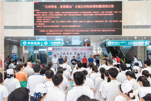 俗话说,“热在三伏”,又到了一年一度养生重头戏“三伏贴”登场之时,7月2日,广西中医药大学附属瑞康医院用一场“三伏养生,冬病夏治”大型三伏贴敷贴活动拉开了“冬病夏治”的序幕。我院院长唐友明,党委书记高宏君,党委副书记、副院长陈日兰,副院长庞刚、韦思尊、陈锋、宋策,带领医院14个科室、近100名医护人员现场为广大市民朋友提供就诊咨询、贴敷治疗。活动启动仪式由高宏君书记主持。