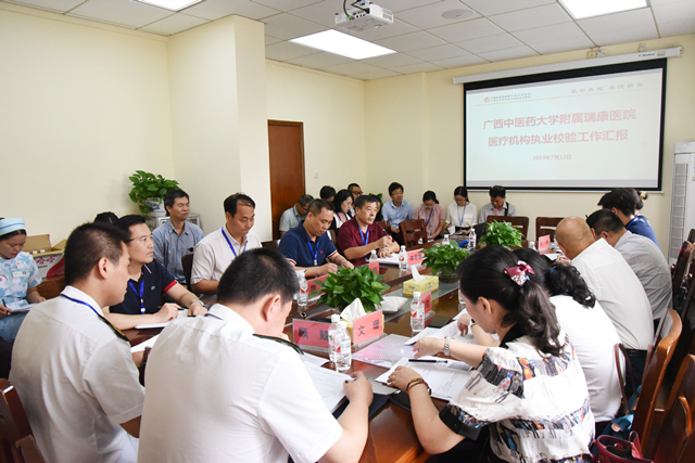 7月12日上午,自治区卫健委医疗机构执业校验专家组一行8人,到我院开展评审工作,我院院长唐友明、副院长韦思尊、陈锋以及相关职能部门负责人陪同。