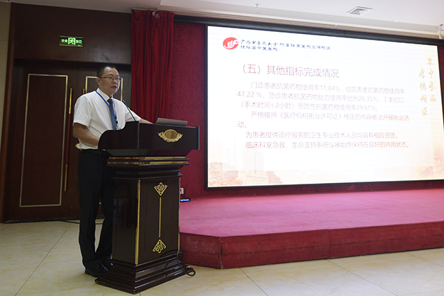 空港院区执行院长梁春才进行医院二甲复评准备工作汇报,他从医院概况、中医药特色优势、临床科室建设、重点中医专科建设、中医药人员配置、药事管理、中医护理、文化建设、医疗质量控制、院感防控、党建工作等方面进行了简明扼要的汇报。