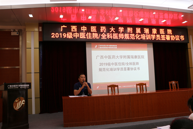 为贯彻落实自治区卫生健康委、中医药管理局关于住院医师规范化培训的相关文件精神,保障住院医师规范化培训医学实践教学的有序开展, 9月2日下午,我院2019级中医住院/全科医师规范化培训学员签约仪式在第七教室顺利举行。主管部门教务科主任汪国翔、副主任姜俊玲,团委书记蒋娴,住培管理办公室陈静珊、莫基安, 2019级住培医师班主任廖子龙及135名住培医师参加了此次签约仪式。签约仪式由姜俊玲主持。