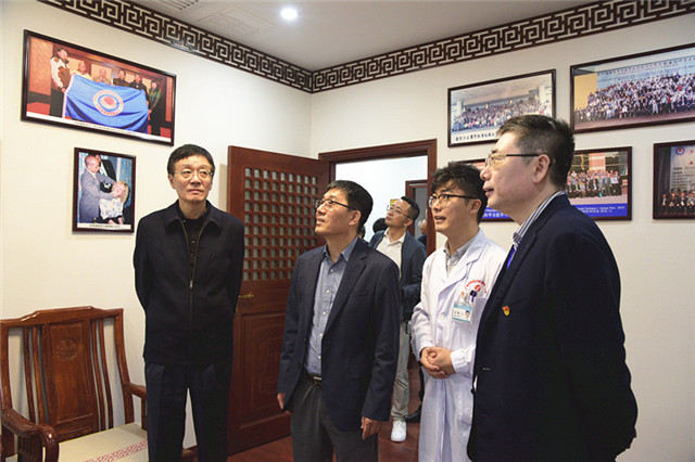 10月28日上午,“973 计划”首席科学家杨永广,吉林中科董事长梁磊一行莅临我院交流指导工作。医院党委书记高宏君、副院长韦思尊、纪委书记黄建民、副院长宋策以及相关职能部门负责人热情接待其一行。杨永广一行先后参观了我院中西医结合转化医学中心、国医大师馆、院史馆、治未病中心、国医堂名医馆、正骨推拿理疗馆、针灸馆,对传统中医文化表现出了浓厚的兴趣,对中医药的神奇疗效发出了由衷的赞叹。