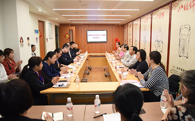 10月30日下午,广西中医药大学护理学研究生联合培养基地签约挂牌仪式在我院B座11楼Ⅰ期药物临床试验中心办公室举行。广西中医药大学副校长戴铭,研究生学院院长唐梅文,研究生学院副院长易蔚,护理学院副院长马秋平一行出席仪式,我院党委书记高宏君,副院长陈锋,护理部主要负责人、护理学研究生导师代表、护理学研究生代表参加仪式。