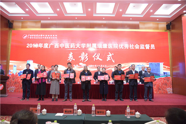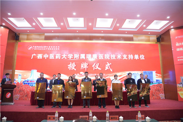 会上,与会领导为南宁马山林圩镇高德村卫生室等126家非公优秀医疗机构授牌“广西中医药大学附属瑞康医院技术支持单位”并举行技术支持签约仪式,还为马山县林圩镇高德村卫生室古武华等19名同志颁发 “2019年广西中医药大学附属瑞康医院优秀社会监督员”荣誉证书。广西非公优秀医疗机构代表发言,感谢瑞康医院一直以来在医疗卫生工作中提供的帮助,也祝愿在未来能开展更深入的交流合作。他表示,瑞康医院让非公立医疗机构的医生有了归属感,因为有了属于自己的组织和学术交流专业平台,有了更明确的发展方向和更规范的发展方针,希望在瑞康医院的带领下,能提高非公立医疗机构的整体水平和社会认可度,同时为广西的非公立医疗机构医生提供更多的展示舞台。