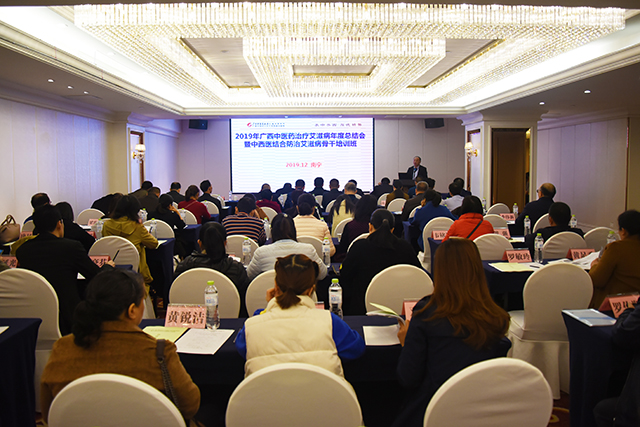按照国家中医药治疗艾滋病试点项目的工作安排,12月24日,我院在金紫荆国际大酒店举办2019年广西中医药治疗艾滋病工作年度总结会暨中西医结合防治艾滋病骨干培训班。会议邀请到中国中医科学院特聘首席研究员、中国中医科学院中医药防治艾滋病研究中心常务副主任王健,北京中医药大学循证医学中心主任、教育部长江学者刘建平,自治区中医药管理局医政处处长潘霜,我院副院长宋策等领导和专家莅临会场授课指导,来自全区20家中医药治疗艾滋病项目单位的主管领导、科室主任以及业务骨干七十余人参加会议。