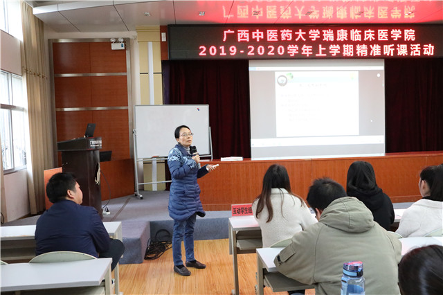 为了不断提升教师的教学水平,打磨教师教学基本功,锤炼教师教学技能,不断提高教学质量。12月23日下午,我院在B座10楼教室开展2019-2020学年上学期精准听课活动。我院党委副书记、副院长陈日兰,副院长庞刚,纪委书记黄建民,副院长陈锋以及各教研室主任及秘书、各科室教学秘书、2019-2020学年上学期承担教学任务的教师及青年教师导师制培养教师约80人观摩听课。活动邀请了学校督学陈雪斌、何梅燕和医院督学刘钧超、朱英、田玉玲等专家进行指导。内科学教研室吴发胜、叶慧恒两位老师现场授课。活动由教务科主任汪国翔主持。