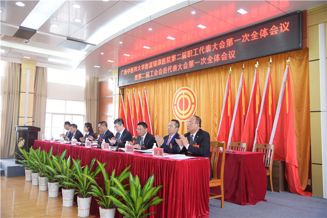 1月10日,我院第二届职工代表大会第一次全体会议暨第二届工会会员代表大会第一次全体会议在十楼学术报告厅隆重召开。会议旨在总结2014年以来的奋斗历程,认清形势,理清思路,牢牢把握时代及医院发展脉搏,科学部署医院今后五年改革发展的工作重点和奋斗目标。医院党委书记高宏君,院长唐友明,党委副书记、副院长、工会主席陈日兰,副院长庞刚、韦思尊、纪委书记黄建民、副院长陈锋、宋策及大会主席团成员在主席台就座。全院171名正式代表出席会议,其中部分离退休职工代表、民主党派代表列席会议。