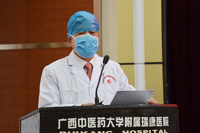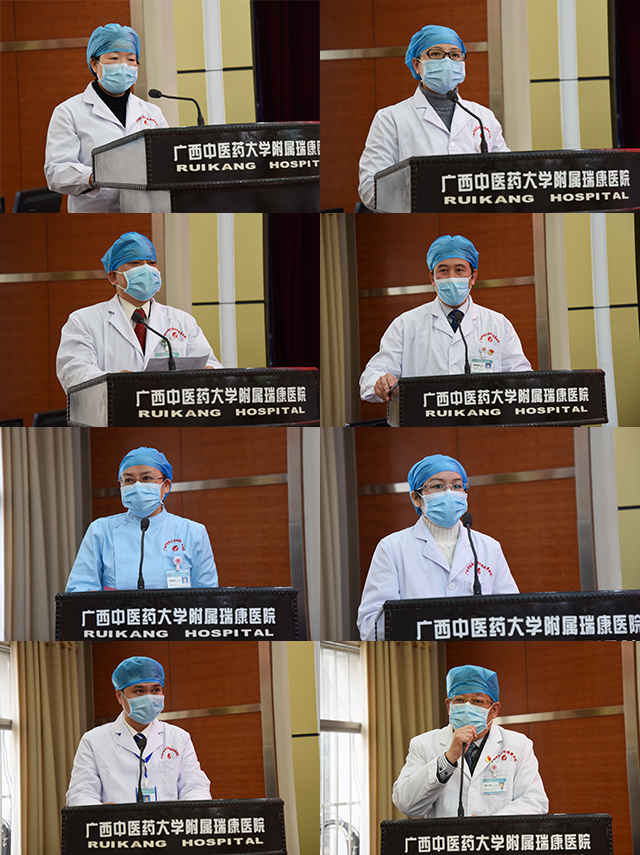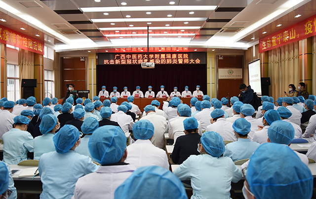 “学校为你们骄傲,瑞康人好样的!”会上,校长代表广西中医药大学领导班子向奋斗在一线的医务工作者们致以崇高的敬意和诚挚的慰问,对医院主动报名驰援疫区和潜在新的疫区的856名医务人员表示赞赏。校长表示,附属瑞康医院历来都有“招之必来、来之能战、战之必胜”的传统,这样的传统在医院的新生代中再次得到体现,你们不仅仅是牺牲休息时间,更是冒着被感染的风险甚至是生命危险主动请缨的举动让人感动和震撼。疫情在,我必在,希望医务人员保重身体,才有本钱抗击疫情。希望医院充分发挥中西医结合和中医药防治方面的特色优势,全力以赴、不畏艰险、不怕牺牲、敢于奉献,一定完成上级交给的抗击新型肺炎、打好防治新型肺炎阻击战的任务和使命。
