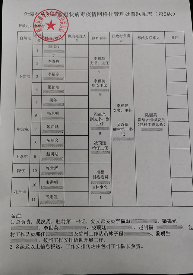 制定念潭村应对新型冠状病毒感染的肺炎疫情网格化管理处置联系表