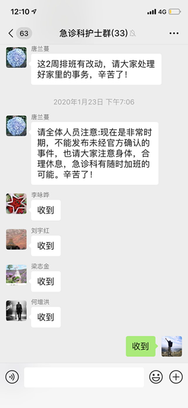 1月25日,医院响应上级部门重要指示精神招募新型冠状病毒感染的肺炎应急医疗队队员,当这一消息发出后,科室医护人员全员积极响应,微信群里志愿报名信息源源不断,主动请缨、奔赴一线,不到半个小时时间,全科47名医护人员全数报名。一句句“我报名” “我可以”“我来”都是医者的责任担当,是青年文明号精神的诠释,更是红色基因的传承。