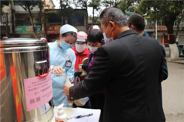 在扶绥县火车站乘客防控工作点,院区派出的医护人员前往对每一个车次、每一位进出站人员进行体温测量,绝对不漏过一人。