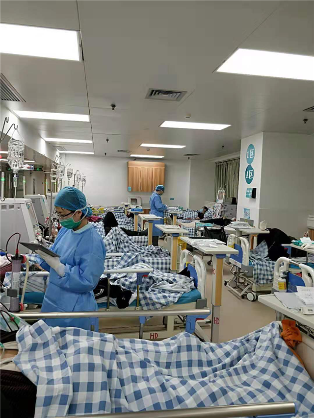 血液透析是一种血液净化技术,他通过将患者体内的血液引流到患者的体外,然后通过有多条空心纤维所构成的透析器,再经过一系列的物质交换将患者体内的代谢废物以及多余水分清除到体外的过程。尿毒症透析患者需要一周三次往返于医院,血液透析中心是个交叉开放环境,规律进行透析治疗的患者们,普遍免疫力低下,属于易感人群,在新型冠状病毒感染的肺炎疫情期间,感染风险陡升,一旦有人发生感染,后果不堪设想。血透医护人员的战场就在这里。46台机器不停运转,承担200余名门诊和病房透患者的透析任务。