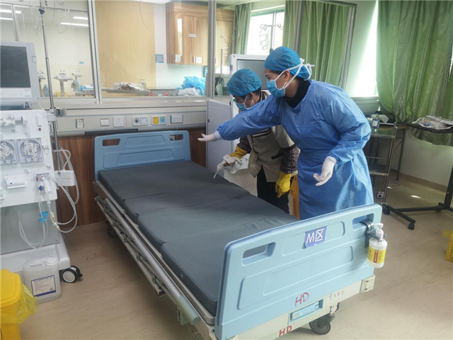 血透医护人员因职责所在,生命相托。为确保透析患者、家属及工作人员的生命安全及健康、保障在新型冠状病毒疫情期间各地透析治疗有序、顺利、安全的进行,在院领导及科主任、护士长的带领下团结协作,面对新冠状病毒疫情,快速反应,根据现行国家标准、行业标准、团体标准和近期国家卫生与健康委员会针对新型冠状病毒不断推出的文件和指南,进行了疫情期间血液净化室对于疫情防控切实可行的具体措施,工作有条不紊。