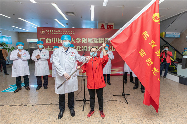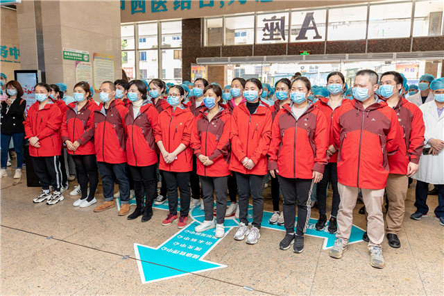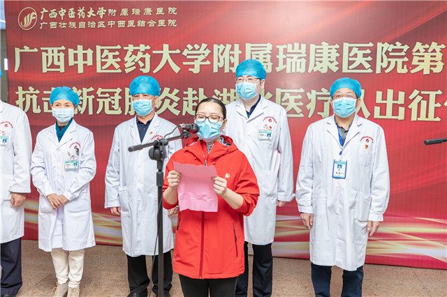 14:30,医院党委书记高宏君,院长唐友明,党委副书记、副院长陈日兰,副院长庞刚、韦思尊,纪委书记黄建民,副院长陈锋、宋策及相关职能科室负责人、队员家属和科室同事为18位驰援湖北的勇士举行了简短而庄严的出征仪式。副院长韦思尊主持出征仪式并宣读医院第二批驰援湖北医疗队队员名单。