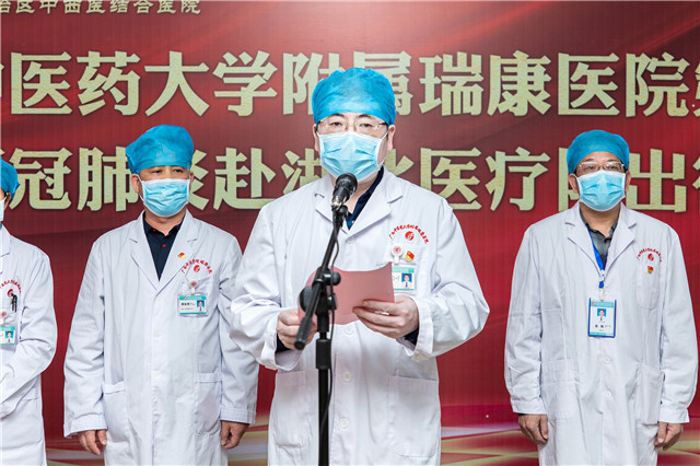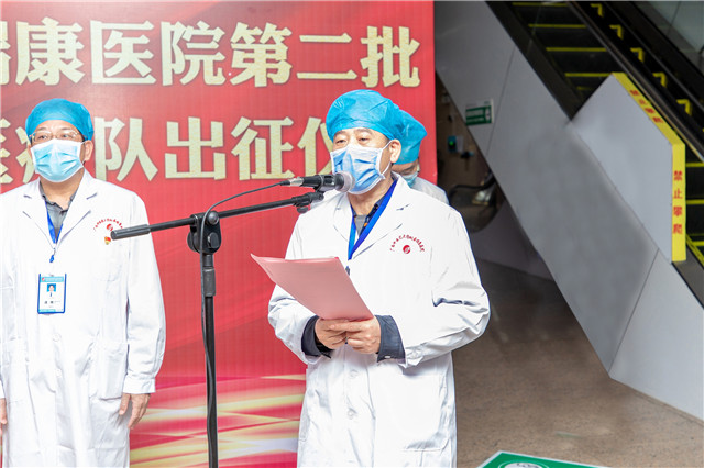 出征仪式上,院长唐友明对我院在短短6个小时的时间迅速集结大批医疗队员驰援湖北抗击疫情给予高度肯定,希望大家以精湛的医术,科学施治,把瑞康医院的光荣传统带到湖北,以实际行动,向党和人民交上一份满意的答卷。同时他对出征的队员提出:一是此次驰援湖北抗疫,责任重大、使命光荣,这是一场考验,更是一次淬炼,大家要发扬“敬佑生命,救死扶伤,甘于奉献,大爱无疆”的职业精神;二是要有坚定战胜疫情的信心。疫情是可防可控,要做到科学防治、精准施救,发挥我们中医药、中西医结合的特色优势,把瑞康医院好的作风,好的技术奉献给武汉人民;三是要做好自身的防护,注意安全,发挥好平时培训、演练的功力,做好自身的防护,只有把自身分保护好了才有能力和精力去救治患者。他同时指出,医院永远是队员们的坚强后盾,一定会从人力、物力、财力去全方位支持队员在前线的工作,做好各位队员的家庭支援保障,竭尽所能解除同志们的后顾之忧,期盼大家平安凯旋!