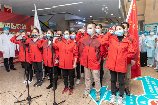 院长唐友明为医院第二批驰援湖北医疗队授队旗,党委书记高宏君为医院驰援湖北医疗队临时党支部授旗,医疗队队长、临时党支部书记唐晓分别接过队旗高高举起,奋力挥舞。在抗击疫情的危难时刻,他们挺身而出、主动请缨,响应党的号召,舍小家为大家,奔赴武汉抗疫一线,为此次抗击新冠疫情继续注入新的医疗救治力量。这是“自强不息、团结拼搏、敢为人先”瑞康精神的最佳诠释,充分体现了新时代瑞康人的使命和担当。