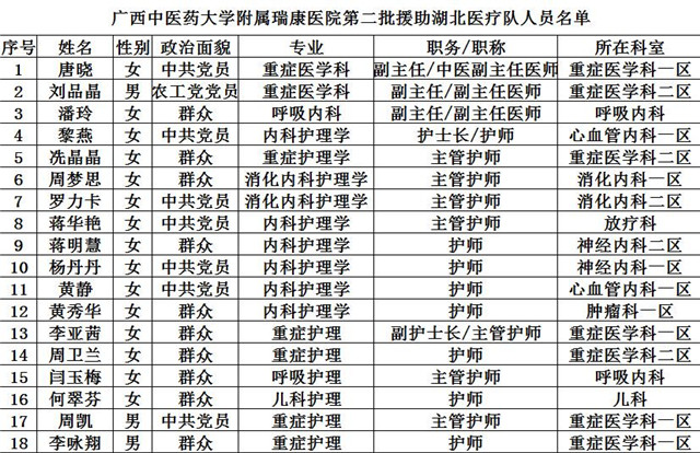 此次我院派出18名精干的医护人员由3名医生和15名护士组成,他们分别来自重症医学科、呼吸内科、消化内科、神经内科、心血管内科、肿瘤科、放疗科、儿科等专科医护人员,重症医学科一区唐晓副主任医师担任医疗队队长。整个队伍有正式中共党员7名。