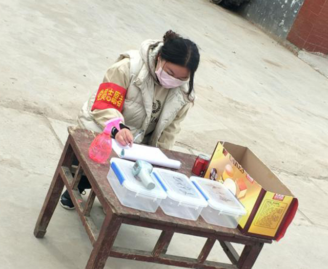 我在乡政府和乡卫生院联合组织的村口封堵查车测体温,在那里,每天有党员和乡政府人员还有乡卫生院派下来的乡村医生,每天24小时轮班制值守,我从2020年1月30日开始志愿值守,早上8点到中午12点,下午2点到6点,到现在每天帮忙值守,帮忙登记,量体温,佩戴着袖章,总感觉有一种使命感驱使着我。