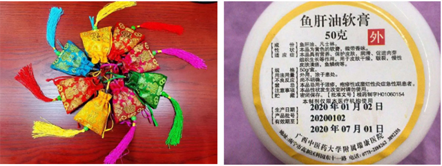 给患者赠送的医院自制的香囊和鱼肝油软膏