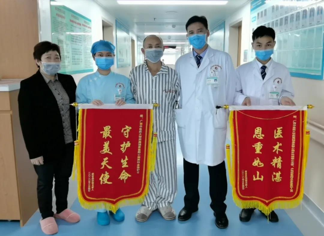 3月4号下午,来自百色市凌云县的吴宗敏及家属向我院胸心血管外科的医护人员们送上了锦旗,感谢他们及时发现自己身体上的大问题,挽救了他的生命。 ▲吴宗敏及家属为科室送来锦旗 故事要从春节的时候说起,吴大哥平时身体健康,但1月31日在家时突然感到腰背疼痛,吴大哥的妻子知道后放心不下,带着他立即到当地医院就医。当地医院初步诊断为腰椎间盘突出才引起的不适,后来经过反复检查,一名B超医生发现了异常,让他立刻卧床休息,由于当地医疗水平有限,建议他转到上级医院治疗。于是,家属联系了我院胸心血管外科主任杨柳山,杨主任了解病情后,考虑到病人有主动脉夹层的可能,一分钟都不能耽搁,让吴大哥立即转送到我院。 2月1日凌晨,吴大哥长途跋涉终于抵达我院,科室立刻为他联系了CT室进行检查。果不其然,引起吴大哥腰背疼痛的正是这种名为主动脉夹层的疾病。 胸心血管外科方恒晓医生介绍道: 像他这种A型主动脉夹层,在升主动脉这个地方有破口,于是血就会流到主动脉内膜和外膜之间,这种病往往十分凶险,如果不及时进行手术,病死率非常高,约有四分之三以上的病人会在48小时内死亡。 ▲主动脉夹层图示 当时,吴大哥的主动脉撕裂范围广,随时都有可能破裂导致死亡,情况危机,必须立即手术,这一诊断着实让吴大哥和妻子吓得不轻,但他们选择相信科室团队,同意立刻进行手术。科室也在第一时间启动主动脉夹层绿色通道。手术需血量大,当时血库缺血,便立即立刻派车到中心血站去取血,同时通知麻醉科准备手术。 这场手术难度极大,最后持续了12个小时,最终在2号凌晨4点50分才顺利完成。方恒晓告诉我们,在手术中,不仅需要把整个升主动脉换掉,还要把头部的几个重要血管换掉,这样的手术在心胸外科手术里往往叫“浴血奋战”。 杨柳山还补充道,这次手术的顺利完成,还得益于医院多学科之间的紧密配合协作,时间就是生命,技术则是保障。输血科、设备科、手术与麻醉科、急诊科等科室的通力协作,才保证了这次能够及时安全地“拆弹”。 ▲吴宗敏及家属送来的锦旗 转危为安后,吴大哥一家对医护团队感激不已,拉着他们的手说,感谢赋予他第二次生命。经过一个多月的调理,目前他已经顺利出院,在出院前,将锦旗送到了医护人员的手中。 新闻报道