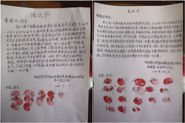 “特此请战,我们随时听候调令,时刻准备再次奔赴临床一线!”一封简单的请战书,摁满了18个鲜红的指印。