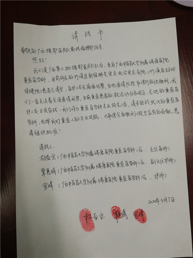 与此同时,广西第三批驰援湖北十堰的医疗队员,瑞康抗疫“铁三角”也向前线指挥部递交了请战书,表示坚决与新冠肺炎战斗到底。