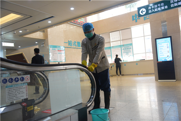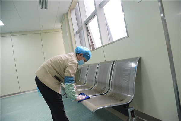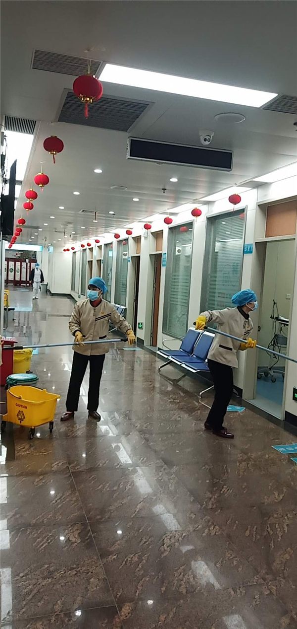 为保障医疗工作稳定运行,医院后勤(物业)人也像广大医务工作者一样,加入抗击疫情一线的工作队伍。院内卫生清洁、病区及公共场所消毒、诊室消毒、医疗垃圾处理、物资运送……角角落落,随处可见保洁人员辛勤劳作的身影。他们在医院内外空气、地面、门帘、垃圾桶、扶手、外围休息椅等进行消毒。每天天还没亮,保洁员就来到办公室,准备好酒精、抹布、水桶等工具,来到住院大楼的电梯,用酒精仔仔细细的擦拭着电梯的每一个角落,从按键、扶手、到轿厢,每一处都反复擦拭好几遍,生怕漏掉一丝一毫。从疫情发生开始,电梯的消毒从日常的每周一次调整到每天二次。“医院是公共场所,每天有那么多人来来往往,我们辛苦弄干净点,病人也能放心”后勤科何丽说到。