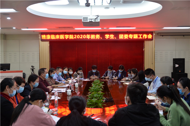 为进一步做好2020年瑞康临床医学院的各项工作,3月13日下午,瑞康临床医学院在医院B座23楼会议室召开2020年教务、学生、团委专题工作会。院长唐友明,党委副书记、副院长陈日兰出席会议,教务科、学生科、团委、护理部等部门负责人及代表参加会议。
