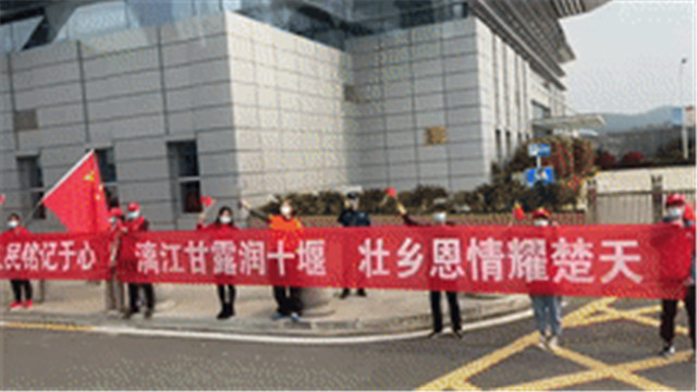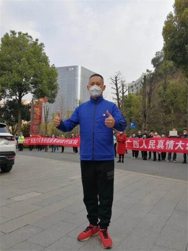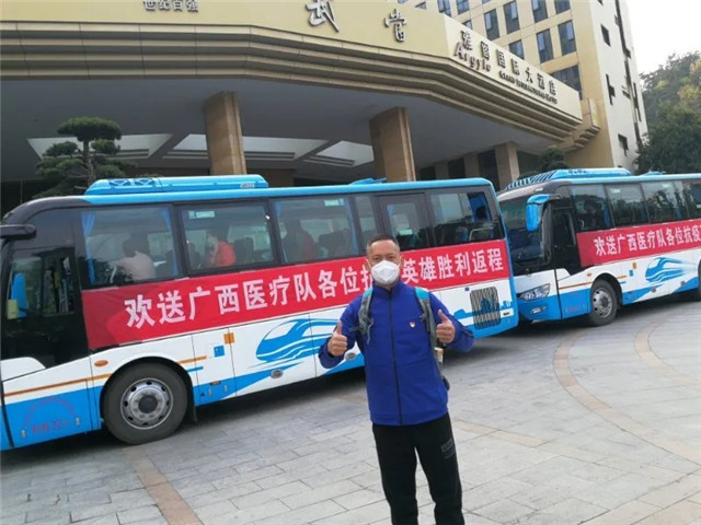 21日一大早,酒店门口的空地上,八辆干净的大巴车一字排开。“三合汤感谢螺蛳粉”“千里驰堰抗疫,壮乡恩重如山”“漓江甘露润十堰,壮乡恩情耀楚天”,大巴车车身上,悬挂着红底白字的横幅,是十堰人民对广西医疗队的浓浓的感激之情。